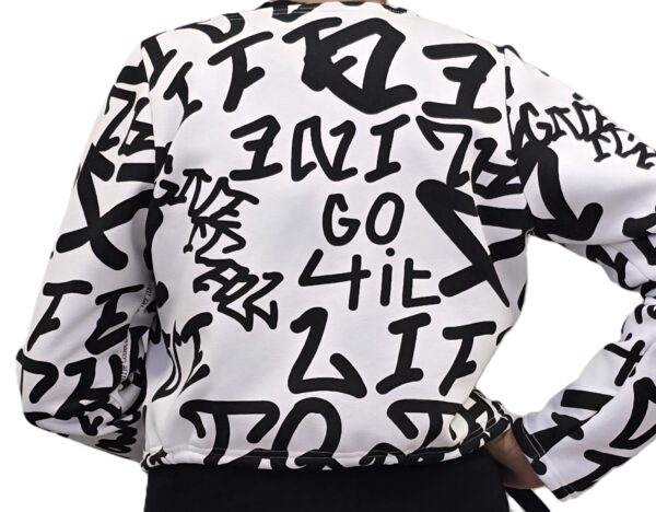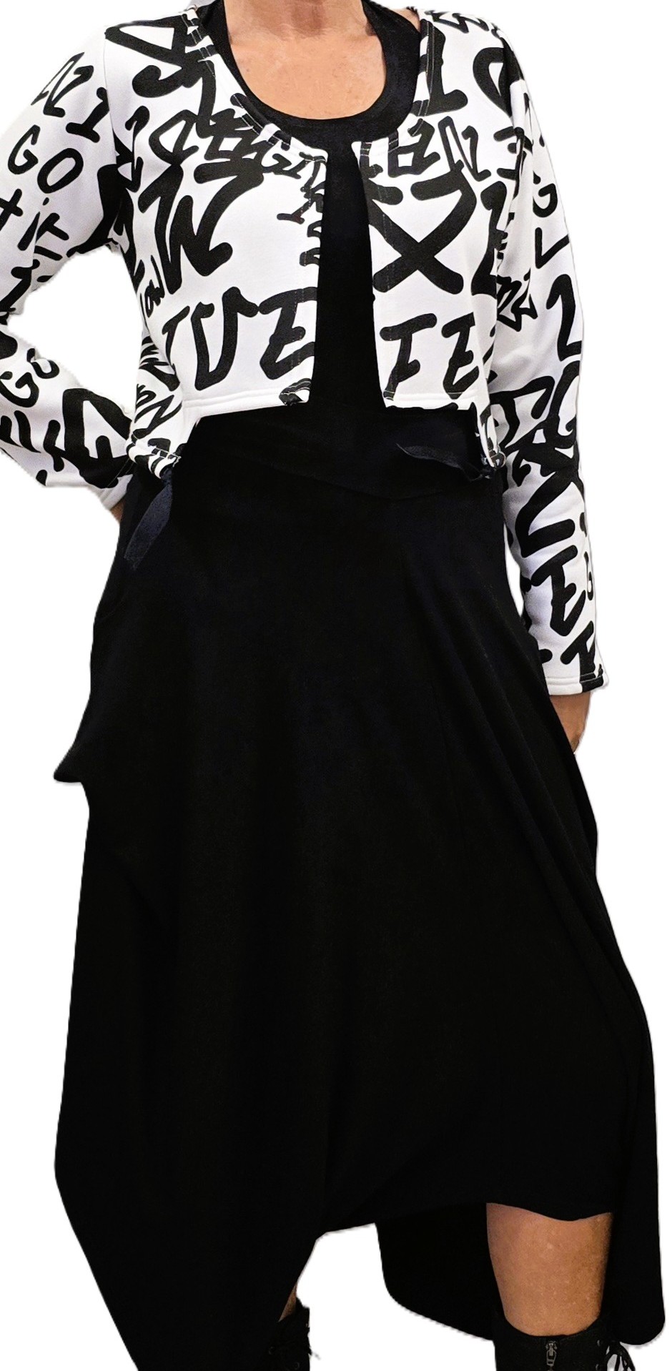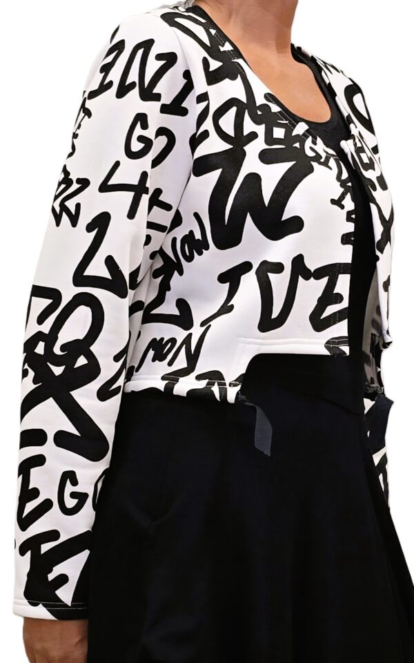 Kort jasje in ecru met zwarte print.