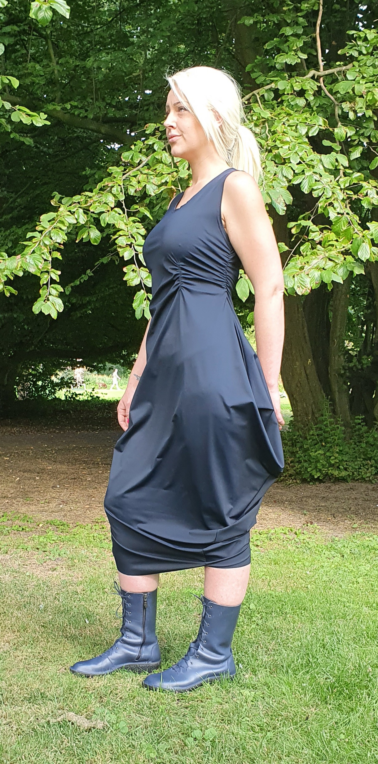Een prachtige jurk van travelstof die onder ieder jasje, top, cape of vest past.