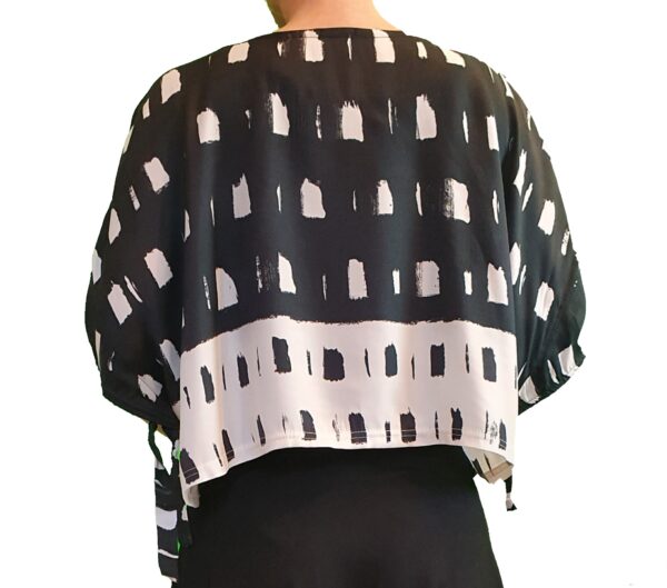 Een kort hesje van zeer zachte viscose in zwart, ecru, en ecru zwart.